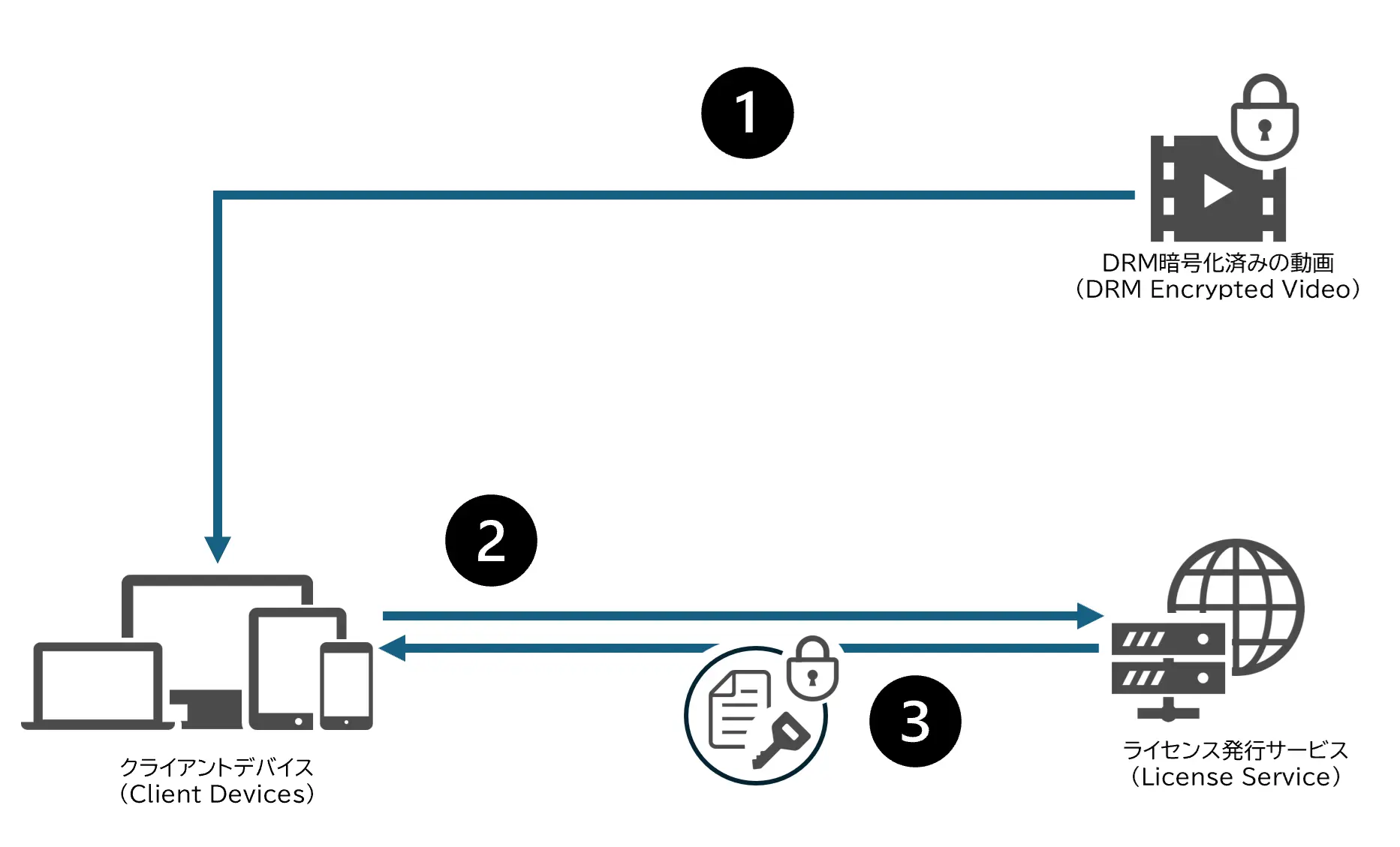 - クライアントデバイスは、DRM暗号化されたコンテンツを再生するために、
